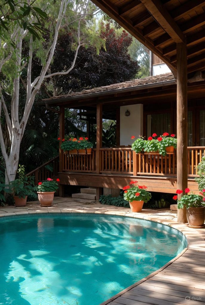 ۴. ایوان یا تراس در طبقه همکف و اول ایوان چوبی یا فلزی با گلدان شمعدانی → بهترین جای صبحانه خوردن.